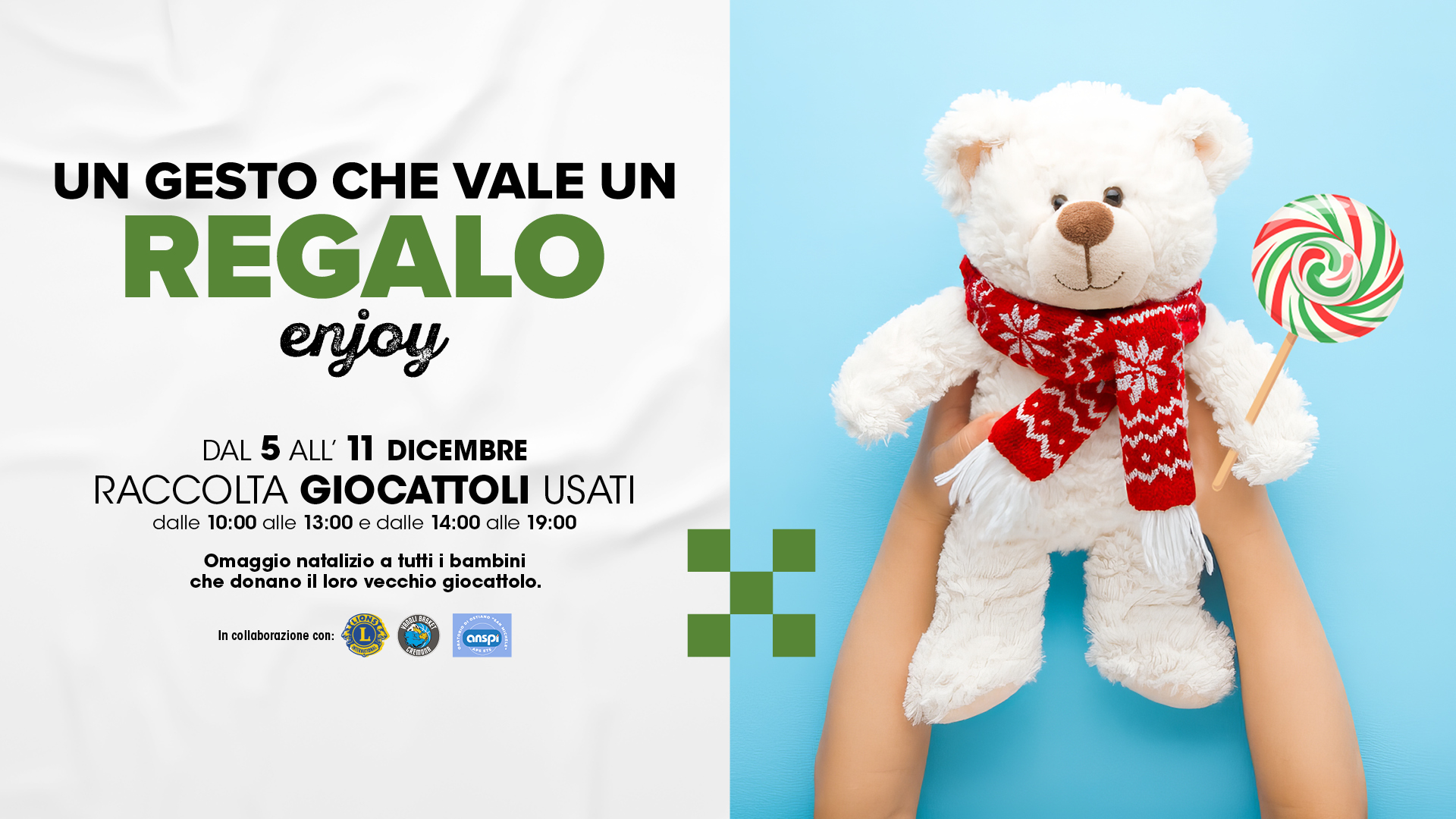 Dal 5 all’11 dicembre, porta il tuo giocattolo usato a CremonaPo e regala un sorriso a chi ne ha bisogno: ogni bambino che dona riceverà un omaggio natalizio e potrà vivere un momento unico di gioia!